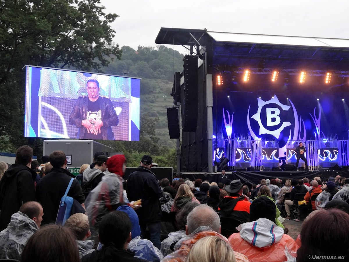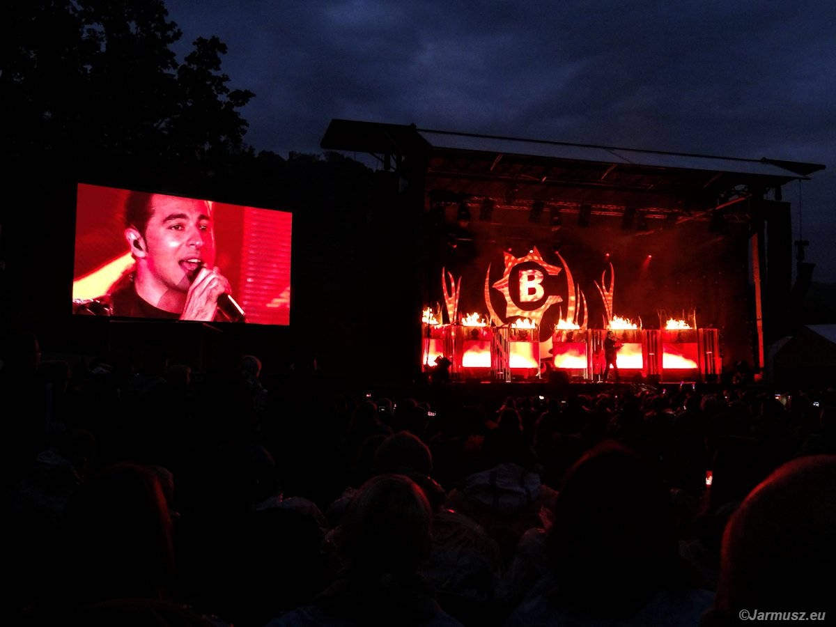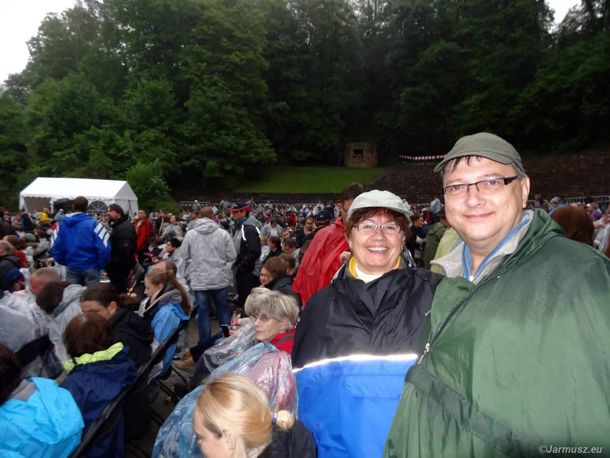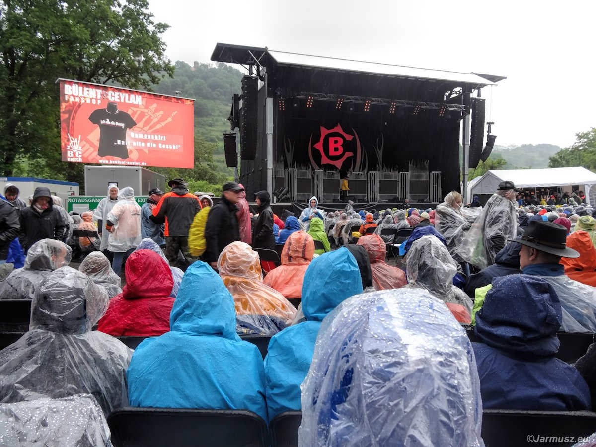 Niespodzianka… Teren przed sceną był zastawiony 2000 krzeseł. Kamienne schody do siedzenia (za nimi jest las i drzewa) były zagrodzone, z powodu przesączonego gruntu i niebezpieczeństwa spadających gałęzi. Mimo deszczu ani jedno krzesło nie zostało wolne. Tego byśmy nie myśleli. I Bülent też na pewno.