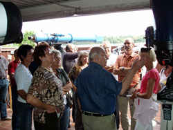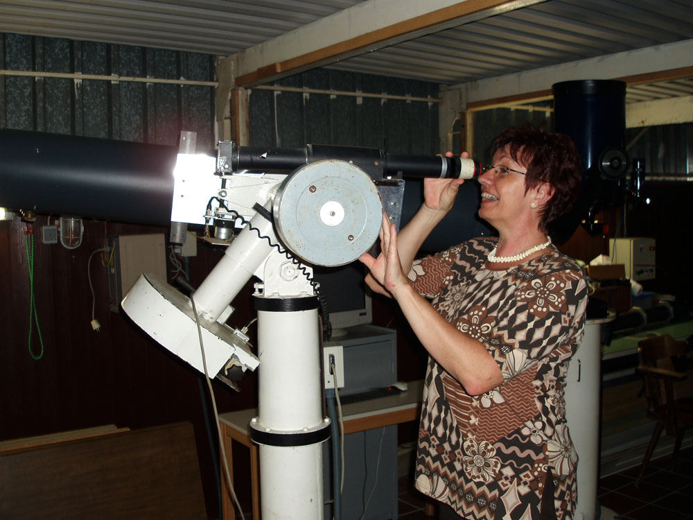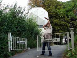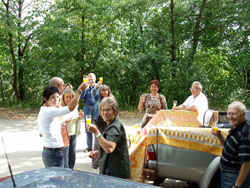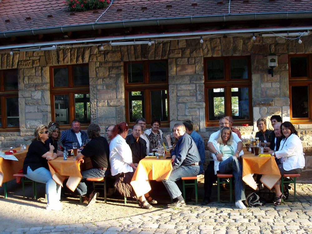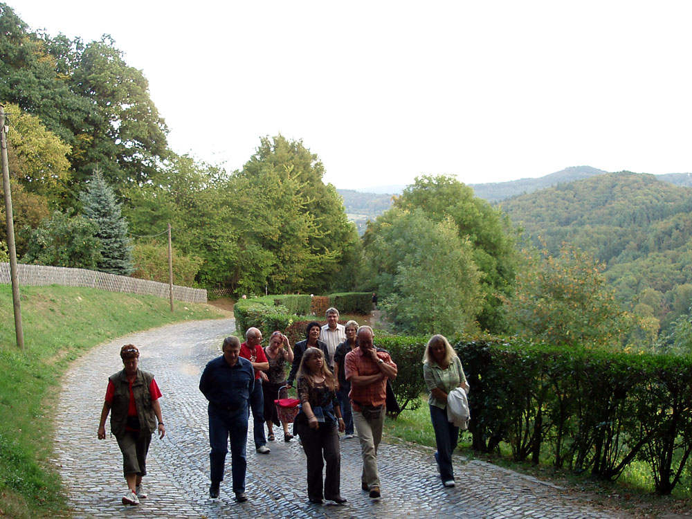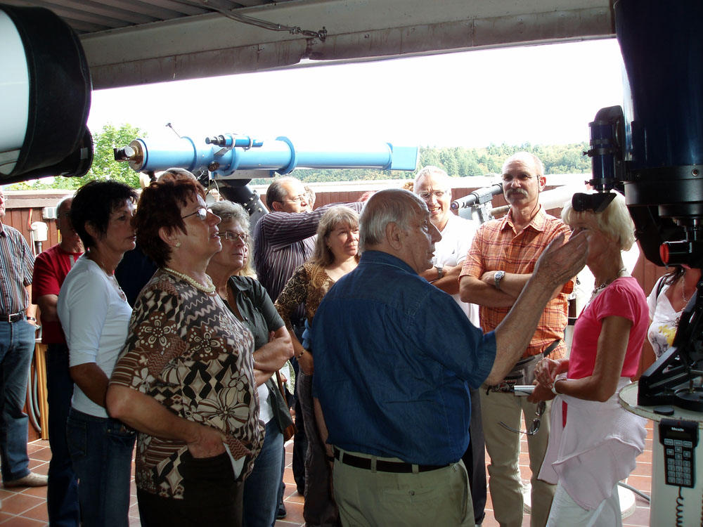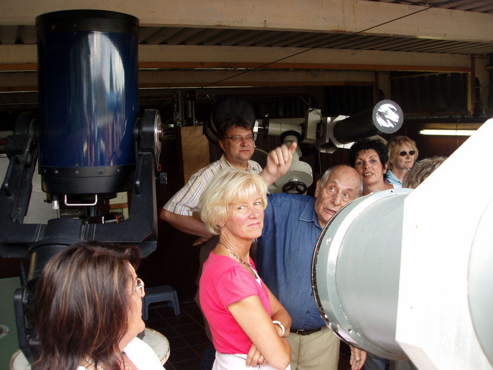 W sobotę byliśmy na spotkaniu z grupą naszego rocznika 56/57. Głównym punktem tegorocznego planu było zwiedzenie obserwatorium astronomicznego. Na parkingu,w lesie, wysoko na górze zamkowej (kto tu już dotrze, ma Heppenheim daleko pod sobą i zamek tuż tuż… już tylko kilka kropli potu) – oczekiwała nas niespodzianka. Przy prowizorycznym barze zostaliśmy przywitani szampanem i rogalikami (żeby żołądek nas nie męczył w obserwatorium). Tym razem grupa była nieliczna, ale wesoła.