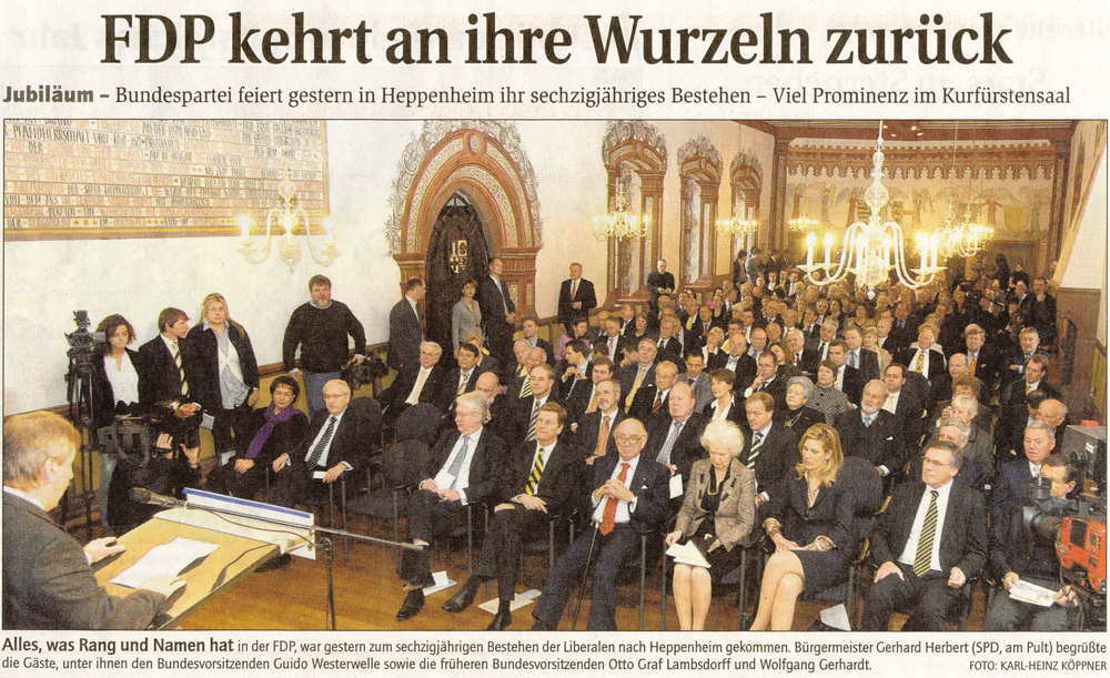 Wczoraj zjechało się do Heppenheim wiele ważnych osobistości. Guido Westerwelle, Otto hrabia Lambsdorf, Wolfgang Gerhard i wielu innych. Plac przed Kurmainzer Amtshof zapełniony był policją, karetkami i techniką TV. W mieście działo się coś ważnego. Niektórzy znali przyczynę, inni dowiedzieli się z TV – FDP (Wolna Partia Demokratyczna Niemiec) obchodziła 60. urodziny. Z tej okazji powrócono do kolebki partii, do Heppenheim. Bo właśnie tu, w Amtshof, została 12.12.1948 założona.