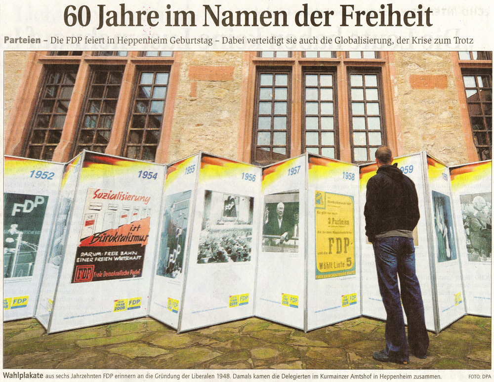 Sześćdziesiąt lat temu, trzy lata po wojnie, parę miesięcy po reformie walutowej, czasy były niełatwe (również tu, w Niemczech), brakowało do życia prawie wszystkiego, również opału. Liberałowie byli już w powiadomieniach proszeni o przywiezienie 1-2 brykietów. Niestety ogrzanie wysokiego zabytkowego pomieszczenia (Kurfürstensaal) było niemożliwe i posiedzenie zostało przeniesione piętro niżej do lokalu Winzerkeller. 90 delegowanych ze stref zachodnich i Berlina zjednoczyło kilka liberalnych ugrupowań w nową partię i nadali jej, po długich i gorących dyskusjach obecną nazwę.