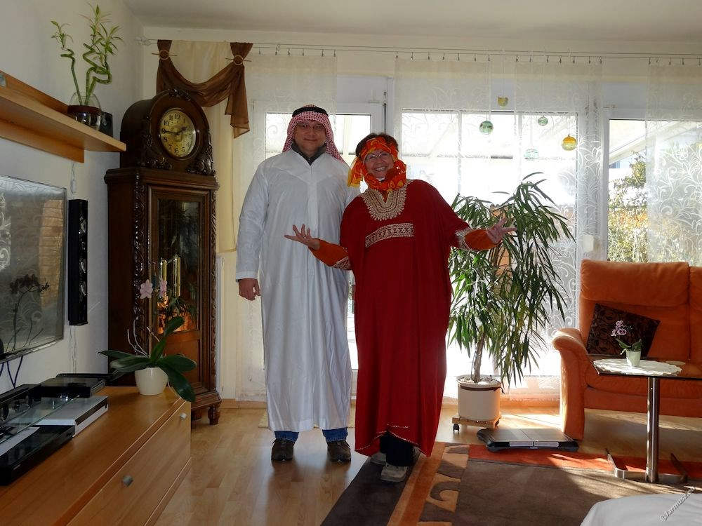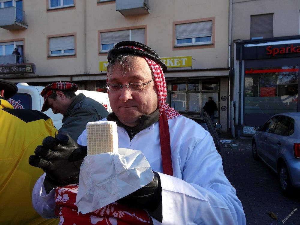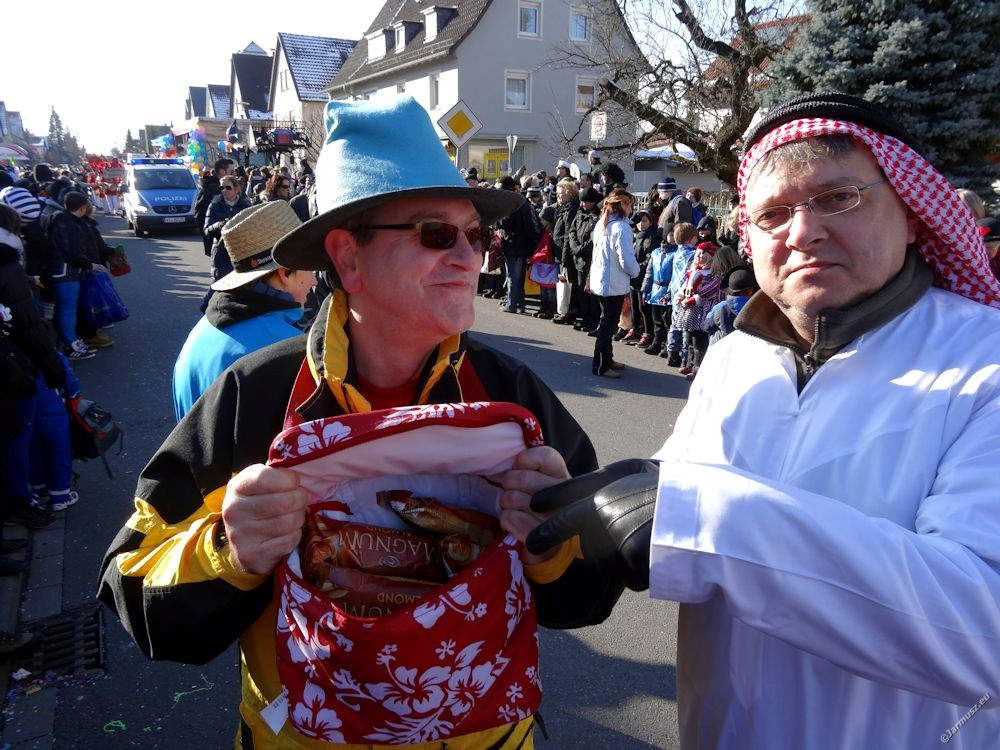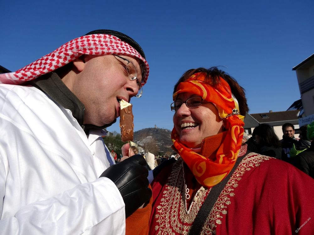 Ruszyliśmy w uliczną zabawę przebrani w nasze autentyczne arabskie stroje – trzeba patrzeć, jakby się przebrać, a jednak mieć miejsce na cieple ciuchy. W końcu stoi się kilka godzin na ulicy. No i podryguje do muzyki każdego przejeżdżającego wozu i grupy. A każdy ma inną muzykę… Prawie sto różnych grup, pieszych i pojazdów, brało udział w pochodzie. Większość lokalnie z Heppenheim, ale i z innych okolicznych miast.
