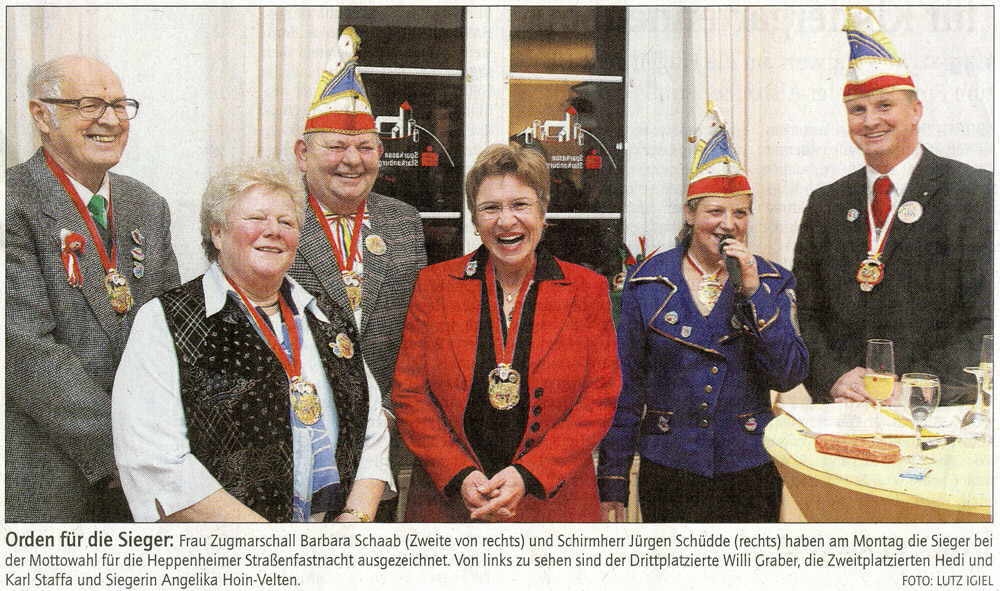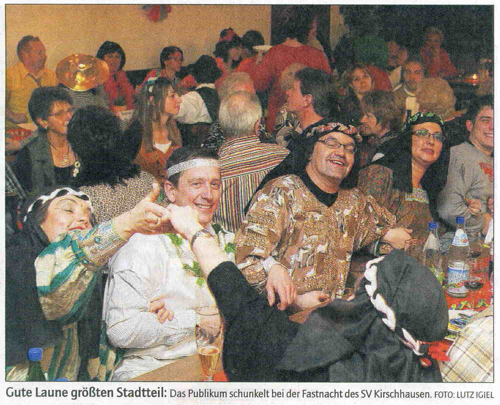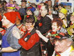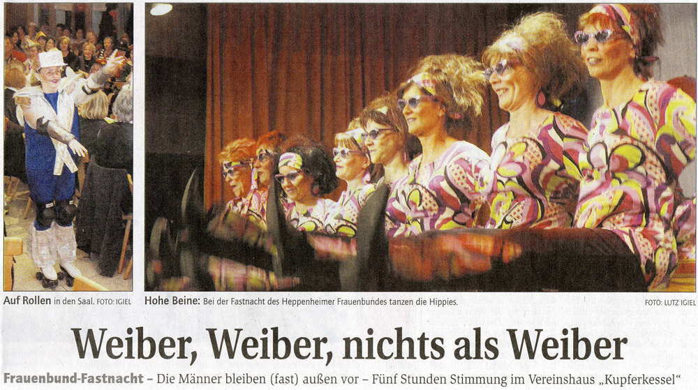 Występ Związku Kobiet Katolickich (Frauenbund) przy St.Peter – to delikates bez porównania! Wstęp mają tylko kobiety oraz ksiądz (który sam też jest karnawałowo bardzo aktywny, no i z zasady bezpłciowy), ewentualnie kapelan i burmistrz. W tym roku jednym z punktów programu był teatrzyk w wykonaniu księdza, kapelana, sekretarki i gosposi parafialnej, podobno majsterwerk! Bracia Piusa by się oburzyli, za taką bliskość kościoła do ludzi i tyle wzajemnej radości. Było pięć terminów posiedzeń, po 5 godzin, przed lekko 300 osób publiczności w sali. Bilety są zawsze wykupione do ostatniego miejsca. Dwa razy udało mi się być na tej imprezie. Wspaniała!!!