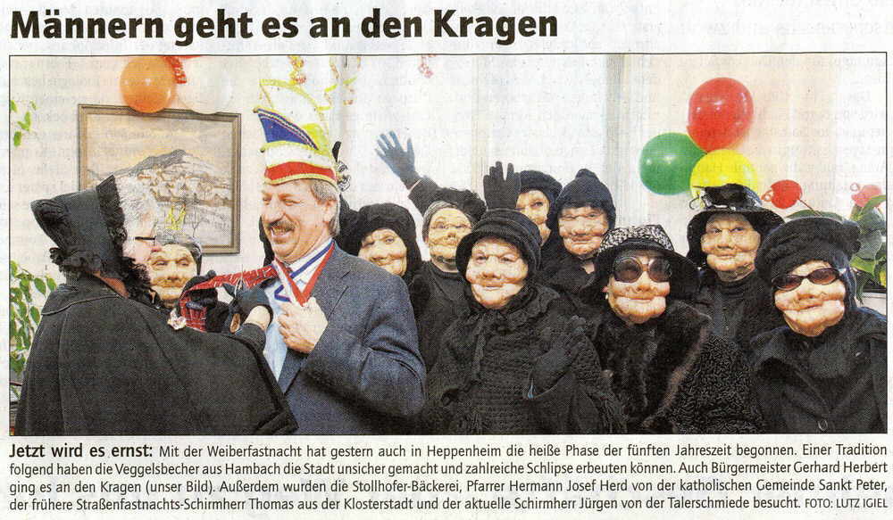 Wczoraj był „Babski czwartek” (Weiberfastnacht) – czyli kobiety rządzą, wdzierają się do ratusza, do biur, banków. Nieustraszona jest zamaskowana grupa z Hambach Veggelsbecher. Tradycyjnie kobiety obcinają mężczyznom krawaty – symbol męskości. Dobrze, że tylko ten symbol… Kto wczoraj ubrał dobry krawat – miał pecha. Każda kobieta ma prawo w każdej chwili wyjąc z torebki nożyczki i ciach-ciach. Panowie chodzą tego dnia dalej w tych obciętych resztkach, ale nie robią smutnego wrażenia, a panie zbierają trofea i przypinają na ścianę.