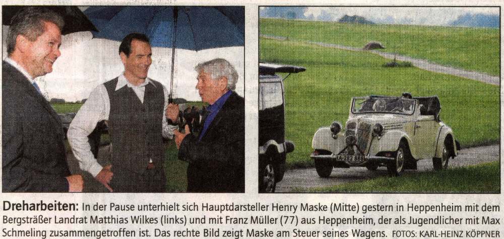 Henry Maske, mistrz świata w boksie, kręcił sceny do filmu o Maksie Schmelingu. Henry gra w tym filmie – cóż by innego – rolę główną. Nawet podobieństwo jest zadziwiające. Reżyser wybrał tę scenerię, bo mu najbardziej przypominała Pomorze, gdzie Schmeling żył do 1945r. Poza tym Heppenheim ma przez współpracę z filmem indyjskim Bollywood doświadczenie z ekipami filmowymi.