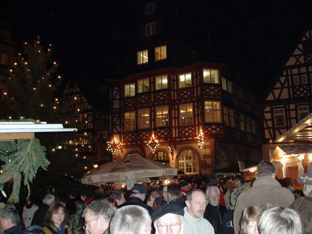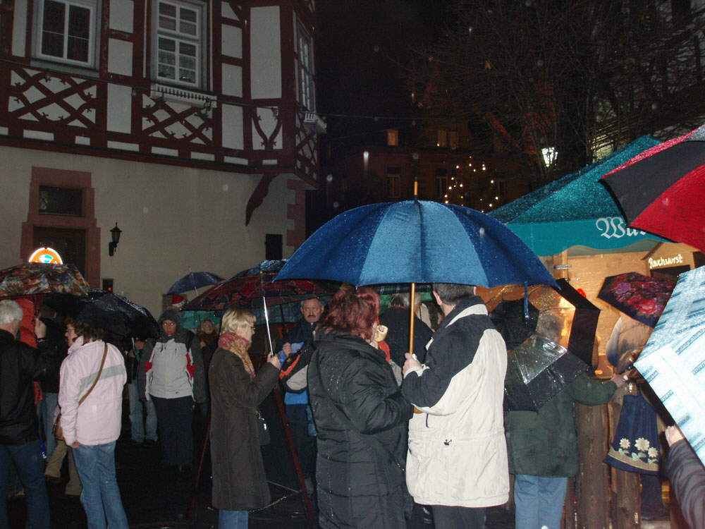 Dzisiaj mieliśmy w Heppenheim na deptaku i starówce nasz Mikołajowy Jarmark. Niestety jest on u nas tylko jeden dzień. I do tego dziś padało. Nawet już bawiliśmy się myślą, żeby nie iść, ale sąsiad zadzwonił czy się wybieramy. No i co? Poszliśmy, w czwórkę weselej, nawet w deszczu. Jak to się mówi?… nie ma złej pogody, tylko złą odzież?
