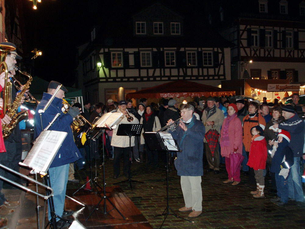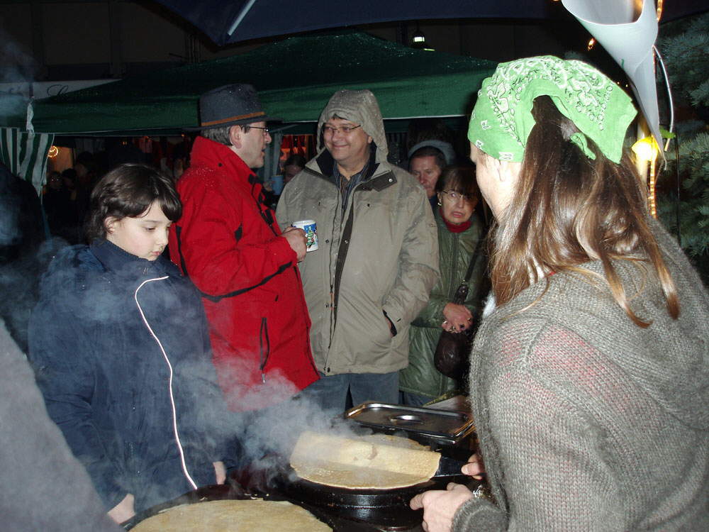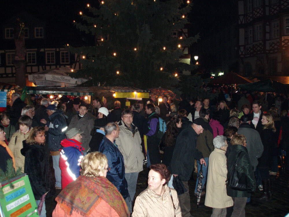 Mimo deszczu było pełno ludzi, z parasolami i pod nimi, stali grupami, parami, jedli kiełbaski, pice, pili grzańce, śmiali się, rozmawiali. Dotarliśmy do stoiska z grzanym winem, pod parasolem, no proszę, jak dla nas. Przestało padać, kiedy napitek akurat się skończył. Rozgrzani, ruszyliśmy dalej. Trzeba zawsze przejść wszystko. Zobaczyć i być widzianym! W takim małym miasteczku nie można nic przeoczyć. Rynek był tak zatłoczony, że czasem ciężko było przejść. Przy ratuszu grała muzyka, chwilę postaliśmy, to należy do atmosfery. Na rynku wypiliśmy po drugim grzańcu i dostaliśmy jeszcze po pierniku do łapki. Dalej w drogę miedzy tłumem i stoiskami. Jesteśmy wszyscy? Kupiliśmy sobie wydanie o renowacji starówki, ciekawe relacje o pojedynczych domach, dokładnie, to co ostatnio pisałam. Było wiele bud z dekoracją świąteczną i inną, zabawkami, świeczkami, rękawiczkami, karmnikami dla ptaków i co tam jeszcze. Wracając, stanęliśmy jeszcze na małym placu, przy muzyce, obok rozchodził się zapach naleśników, znów zaczęło padać, więc następna runda rozgrzała nasze żyły, do tego dali do popróbowania adwentowego ciasta.