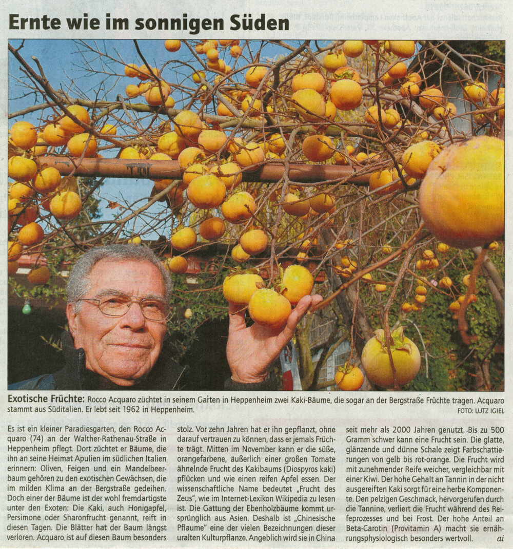 W uzupełnieniu ostatniego postu, znaleźliśmy dziś w gazecie (Starkenburger Echo) piękne zdjęcie. Pan Rocco z Ampulii (Włochy), żyjący tu ponad 40 lat obsadził swój ogród wspomnieniami ojczystych terenów – drzewa oliwne, migdałowce, figi.