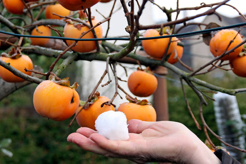 Mróz i zimno potrzebują również owoce kaki, żeby dojrzeć i stracić cierpki smak. Kaki (sharon) rosną w Heppenheim, jak ju pisalam, w jednym ogrodzie, zasadzone przed laty przez hobbystę. Nasz sąsiad zna właściciela i czyta regularnie nasz blog i tak Jurek został zaproszony jako osobisty fotograf kaki. Przyniesiony egzotyczny owoc delektowalismy pierwszy raz. Smaczny, słodki, aromatyczny, chociaż smak jest trochę niecodzienny.