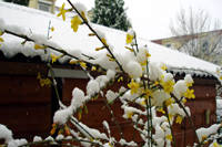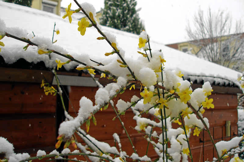Nasz jaśmin zimowy tez chce zimy, by przeżyć. Cieszy oko na tle zimowej bieli czy szarości, nie przeszkadza mu śnieg, ani minusowe stopnie, kwitnie, kiedy w okół wszystko marznie. Taka pomyłka natury. Ale bardzo miła.
