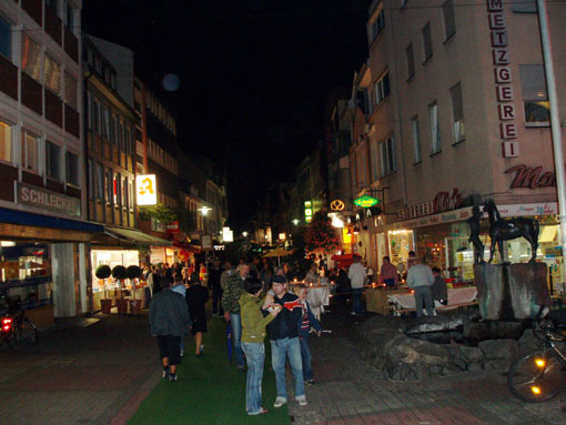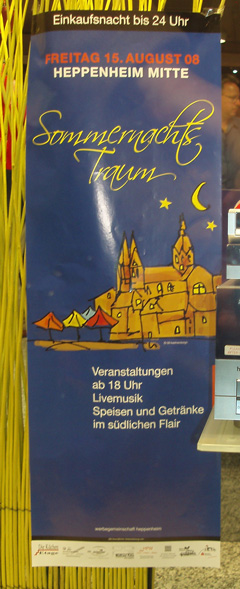 Małe miasteczka mają ten mankament, że życie i handel uciekają z centrum i rozwijają się wspaniale na pograniczach. Miasta muszą sobie czasem coś wymyślić, żeby publiczność znów ściągnąć na deptaki handlowe i trochę rozruszać. I tak mieliśmy wczoraj imprezę na głównej ulicy handlowej, która w Heppenheim jest tak długa, że jakby się dobrze rozpędzić na początku, to się koniec przeoczy. Ale tym razem była zapełniona publicznością. Od 18:00 do północy tętniące życie na deptaku, gdzie na co dzień o tej porze wszystko zamiera. Oczekiwaliśmy obiecanej „atmosfery jak na urlopie w południowych krajach” – i tak było. Światła, świece i pochodnie przed otwartymi sklepami, cocktaile, jedzenie południowej kuchni, muzyka. Wiele ciekawych klientów, którzy tu w odprężonej atmosferze coś odkryli, tam coś kupili. Lekką ręką, jak na urlopie.