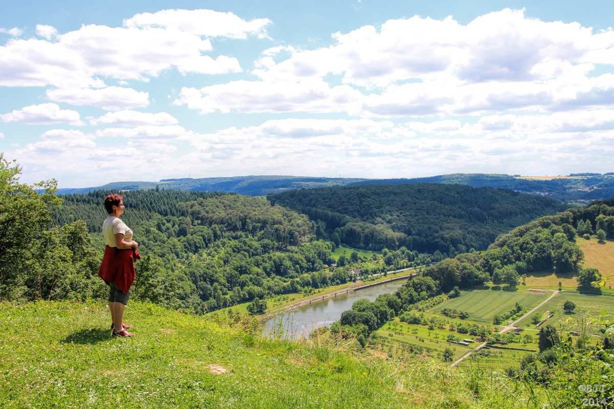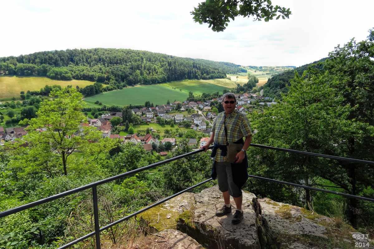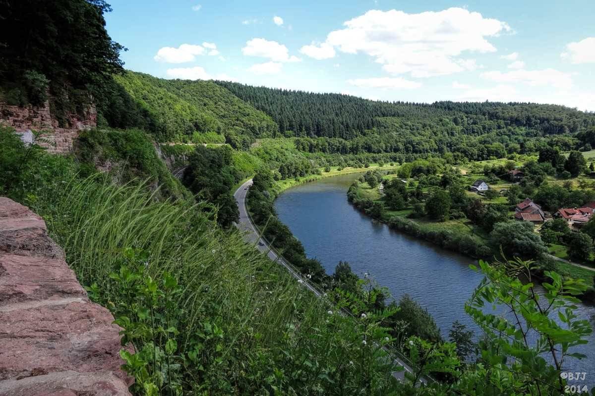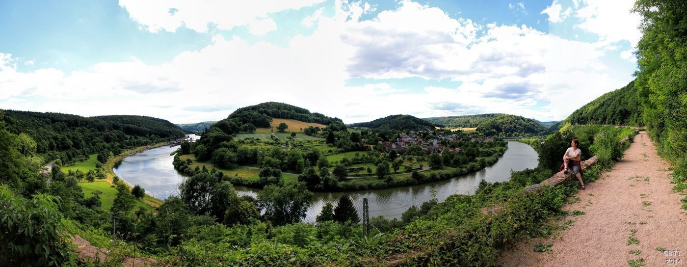 Na koniec wąwozu, przy wyjściu otworzył nam się krajobraz na Neckar, wioskę, Odenwald. Dość długi kawałek idzie się naturalnie ułożoną drogą wzdłuż zbocza wysoko nad Neckarem. Potem już tylko te 100 metrów przez las do góry i wędrówka była skończona. Ok 2 godziny i jutro bóle w mięśniach. Oj…