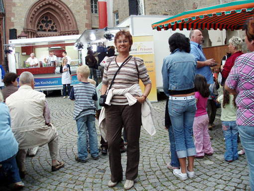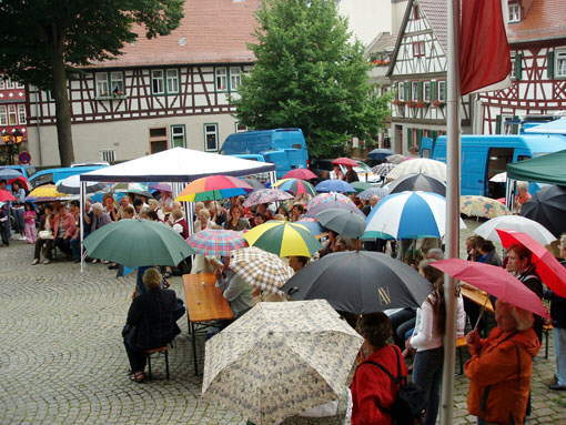 Plac na starówce, przed Katedrą Sankt Peter zapełnił się publicznością, chociaż chmury nie zapowiadały nic dobrego. Obawy się potwierdziły, na czas trzeba było szukać dobrego suchego miejsca, przed wejściem do kościoła (super widok, bo ze schodów), ja zdecydowałam się najpierw na zadaszony punkt sprzedaży szampana, a potem też pod kościół, inni na bufet z ciastem i kawa, a ci którzy nie chcieli stracić swoich miejsc siedzących, schronili się pod parasolki. Ale mieszkańcy Heppenheimu są ciekawi, wytrwali i nie z cukru – trochę deszczu nas nie zniechęca. W nagrodę zaświeciło słońce.